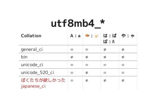 4月にMySQLの日本語コレーションについて語り合う場に呼ばれていろいろ話を聞いてきました。すぐにブログを書こうと思ったんですが、はや2ヶ月経過…。 ときどき、自分がMySQLの文字コードに関して発表する際に、次のようなスライドをいれてるんですが、 MySQ…