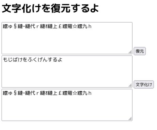 これは SmartHR アドベントカレンダーの4日目の記事です。 qiita.com といっても内容は会社とは関係ありません。 文字化け復元ページを作った。 tmtms.net 使い方 最初に「繧ゅ§縺ー縺代r縺オ縺上£繧薙☆繧九h」という文字化けした文字列が入力されてる。 「…